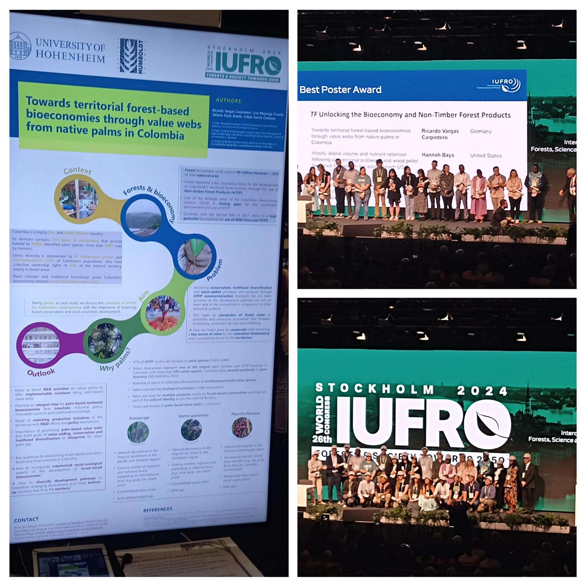 At the 26th IUFRO World Congress “Forests and Society towards 2050” in Stockholm we presented the poster “Towards territorial forest bioeconomies through value webs of native palms in Colombia”, prepared by researchers from the University of Hohenheim and the Center for Economics and Finance of Biodiversity of the Alexander von Humboldt Institute for Biological Resources. The poster was presented by Tatiana Rojas and Ricardo Vargas Carpintero, and was awarded as the best poster of the Task Force “Unlocking the bioeconomy and non-timber forest products“. In this work, we visualized socio-biodiverse territorial bioeconomies based on native palms in Colombia and highlighted the need for collaborative R+D+I processes. During the presentation, we announced the NEXUS workshop as the beginning of the network to enhance these collaborative processes.